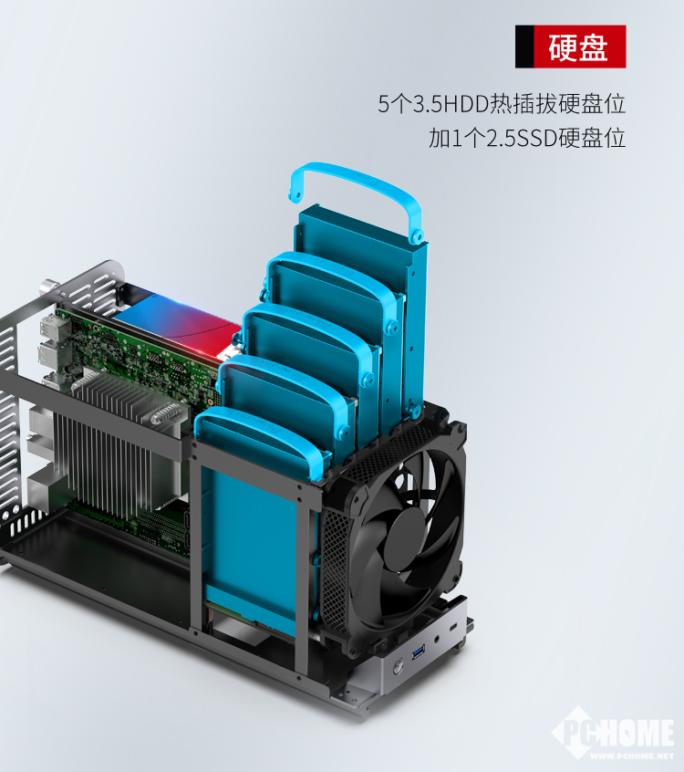 N1采用了抽拉式结构,270度开放式组装方式,可横竖两种方式放置。其使用了2.5mm铝合金和1mm钢板,整体尺寸为170mm * 354mm * 217mm,拥有13L的小体积,重量为3.8kg。在这并不大的空间里,N1提供了五个3.5英寸HDD热插拔硬盘位和一个2.5英寸硬盘位,前者用于存放数据,后者可用于安装系统和软件。其内部可安装ITX结构的主板,机箱提供了一个半高扩展槽位置,方便用户安装网卡、阵列卡甚至显卡(不超过185mm)。