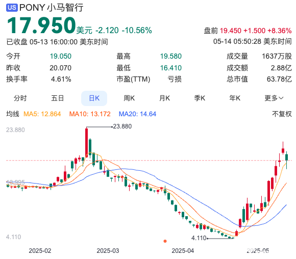 北京时间2025年5月14日,小马智行ADR美股盘突然大涨8%。近一个月以来,小马智行ADR美股已翻了4.5倍。