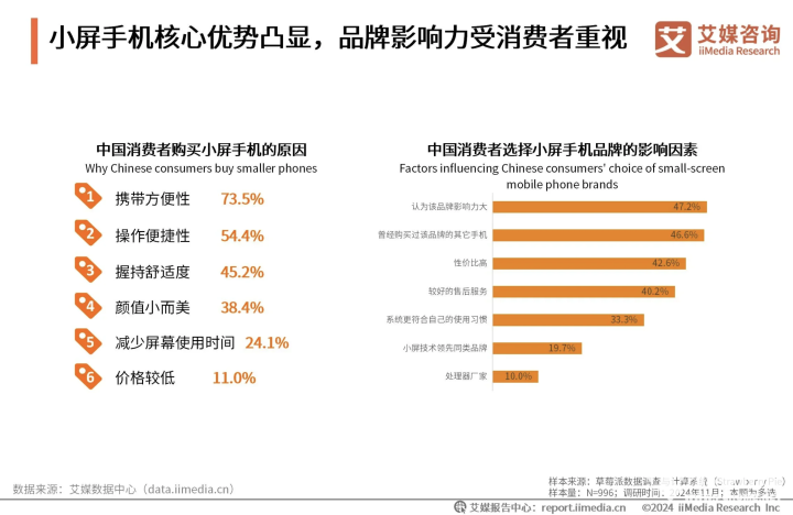 据艾媒咨询报告显示,73.5%的消费者购买小屏手机的主要原因是携带方便,45.2%的消费者看中的是轻薄手机的握持感是否舒适。