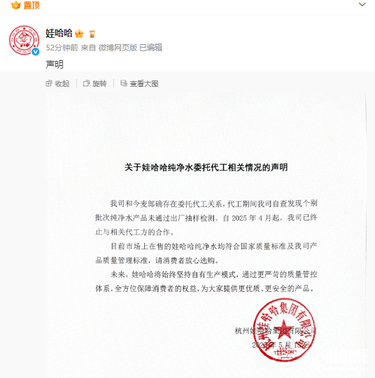 随后,哇哈哈集团官微紧急发布公告承认代工关系属实。哇哈哈表示,“公司和今麦郎确存委托代工关系,代工期间公司自查发现个别批次纯净水产品未通过出厂抽样检测,自2025年4月起,公司已终止与相关代工方的合作”。