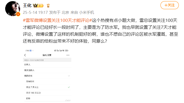 2025年5月15日消息,近日,小米创办人,董事长兼CEO雷军的微博设置关注100天才能评论,话题冲上热搜。5月14日晚,小米集团公关部总经理王化发文回应,雷总设置关注100天才能评论已经好长一段时间了,主要是为了防水军。