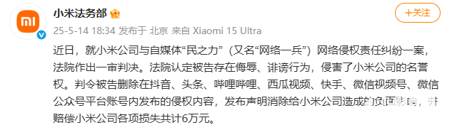 值得注意的是,当天,王化转发了小米法务部发文显示,小米公司与自媒体“民之力”(被告人)网络侵权责任纠纷一案一审判决,判令被告删除在抖音、头条、哔哩哔哩、西瓜视频、快手、微信视频号、微信公众号平台账号内发布的侵权内容,发布声明消除给小米公司造成的负面影响,并赔偿小米公司各项损失共计6万元。