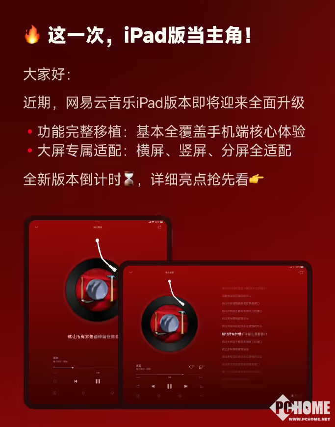 昨日晚间,网易云音乐宣布iPad版本即将迎来全面升级,功能完整移植,基本全覆盖手机端核心体验。