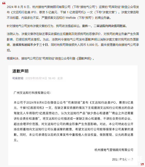 去年8月6日,杭州接地气营销顾问有限公司运营的 “司库财经” 公众号,发布《文远知行赴美IPO,募资5亿美元,干掉1亿底层司机》一文。文远知行指出,该文章标题不当,内容多处失实,严重损害公司商业形象。针对此,文远知行提起诉讼,一、二审均胜诉。法院认定,文章存在无根据的主观臆测及恶意贬损评价,负面影响公司商业形象,侵犯名誉权。