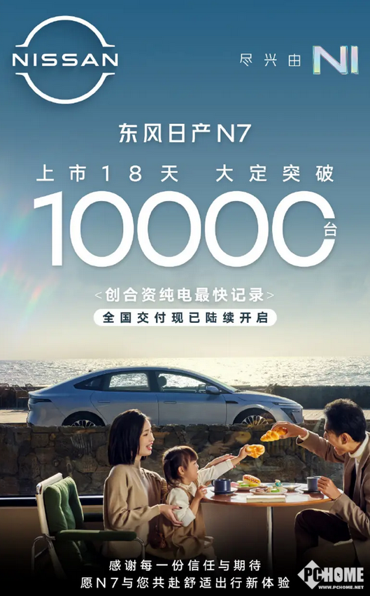 今日东风日产官方宣布N7正式开启全国交付,自4月27日上市以来,仅仅18天,大定订单就突破了10000台,展现了强劲的市场表现,创合资纯电最快记录。