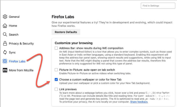 此前,Firefox用户仅能从少量精选图片或纯色背景中进行选择。而现在,在Firefox 138里,用户打开浏览器后,进入 “设置” 中的 “Mozilla Labs” 部分,勾选 “为新标签页选择自定义壁纸或颜色” 选项,无需重启浏览器,就能上传自己喜欢的图片作为新标签页背景。