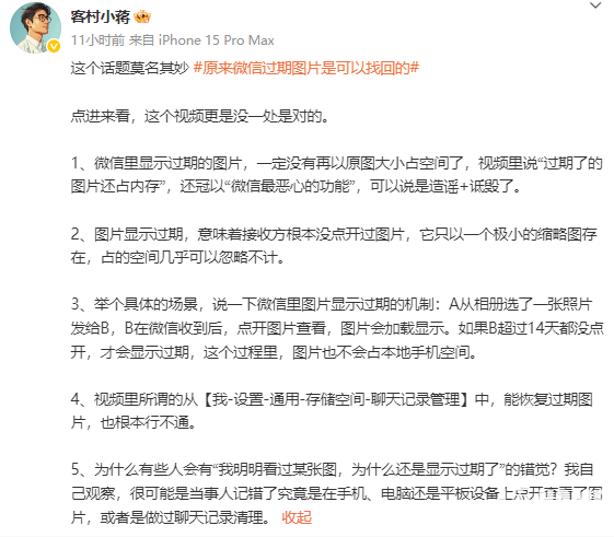 该员工称“过期的图片还占内存”被冠以“微信最恶心的功能”可以说是造谣+诋毁了。并且表示,图片显示过期意味着接收方根本没有点开过图片,它只是已一个极小的缩略图存在,占的空间几乎可以不计。