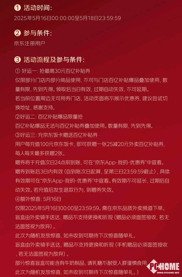 据京东App活动规则显示:该活动时间是2025年5月16日当天,需要在京东品质外卖频道下单,盲盒由外卖骑手送达,赠品不支持更换和折现。对于手机赠品的配送,赠品必须面签接受,否则则视为放弃。