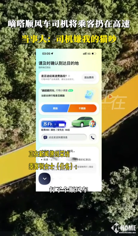 女乘客表示,她坐车时带了一只宠物猫和行李,从江苏盐城前往江苏南通,上车时发现车辆的车牌号和平台上的显示不符,但依然选择乘坐该车辆。乘坐过程中,猫一直在叫,司机显得不耐烦便把音响调得很大,矛盾升级后,司机直接将乘客扔在了高速上,出于安全考虑,女乘客与司机进行沟通,要求司机将她放到服务区,但遭到司机的拒绝。