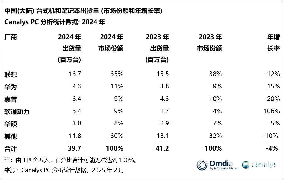Canalys披露的数据显示,2024年,中国市场PC出货量达3970万台,而华为的出货量同比逆势增长15%,市场份额提升2个百分点至11%。太平洋证券认为,“由于华为是中国PC市场的主力军,其推出的鸿蒙PC有望在信创市场上占据重要份额。”