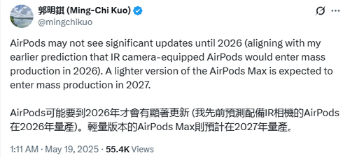 2025年5月19日消息,据分析师郭明錤爆料,今年的苹果AirPods不会有重大更新,AirPods可能要到2026年才会有重大更新,2026年将量产配备红外摄像头的AirPods,2027年将量产轻量版本的AirPods Max。