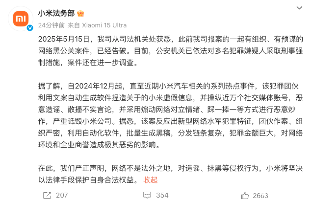 2025年5月19日,小米法务部对外表示,一起黑公关案件成功告破。据悉,该犯罪团伙手段恶劣,通过操纵近万个网络账号,有组织、有计划地对小米进行诋毁抹黑。其发布的大量虚假负面信息,严重误导公众认知,对小米品牌形象造成极大损害。