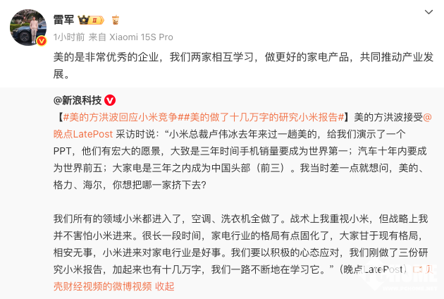 此前,美的集团董事长方洪波在接受晚点LatePost采访时谈到小米,称小米总裁卢伟冰去年到访演示PPT,展示了宏大愿景:三年手机销量世界第一;十年内汽车成为世界前五;大家电三年成为中国头部(前三)。方洪波表示,小米涉足美的所有领域,战术上重视小米,但战略上并不惧怕。他还提到,家电行业格局曾固化,小米进入带来新气象,美的已做三份研究小米的报告,共十几万字,一路在不断学习。