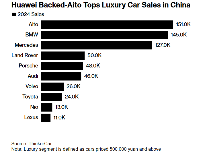 彭博社称,赛力斯曾经只是一家小型中国汽车制造商,以售价3万元的微型面包车而出名。自2021年与华为合作,推出高端电动及混动SUV品牌“问界”(AITO),陆续发布上市问界 M9、问界 M8、问界 M7、问界 M5等车型,产品获得市场肯定。数据显示,2024年问界M9交付量超过15万辆,成为50万以上车型销量冠军。此后,赛力斯得到迅猛发展,汽车销量增长超两倍,成为中国高端汽车市场(50万以上车型)中销量最高的品牌。