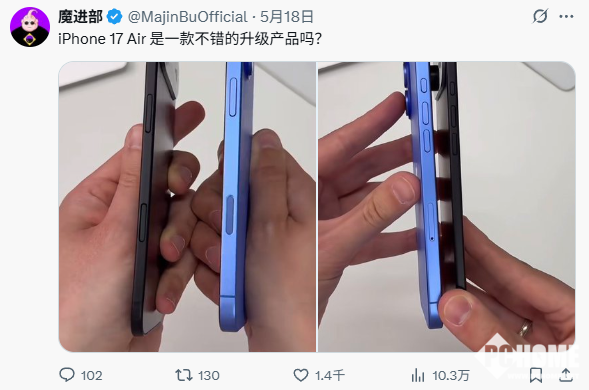 近日@MajinBuOfficial在X平台分享了一组苹果iPhone 17 Air(未定名)与iPhone 16 Plus的对比照。