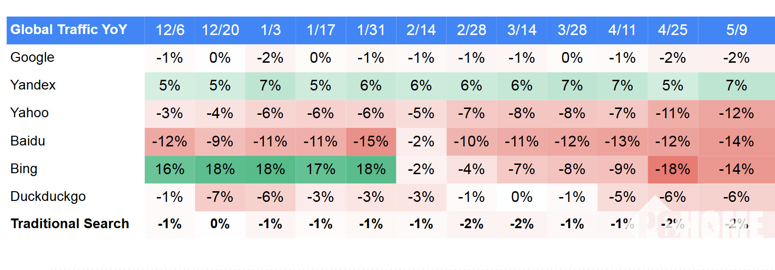 同期,其他搜索引擎也有不同表现。Yandex流量呈现增长态势,在多个统计节点保持5%-7%的同比增长。而 Bing 前期增长显著,最高达 18%,但后期也出现大幅下滑。Google、Yahoo、Duckduckgo 等流量大多处于同比下跌状态。