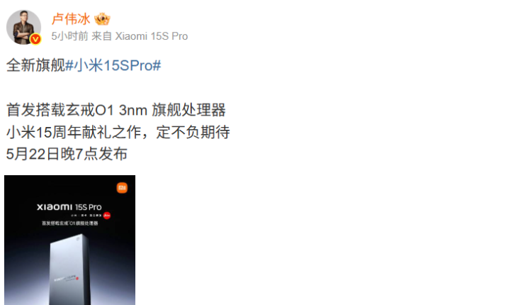 今日,小米集团合伙人、总裁,手机部总裁,小米品牌总经理卢伟冰发文宣布,首发搭载玄戒O1 3nm旗舰处理器的小米15S Pro手机将于5月22日晚7点发布,这是小米15周年的献礼之作。