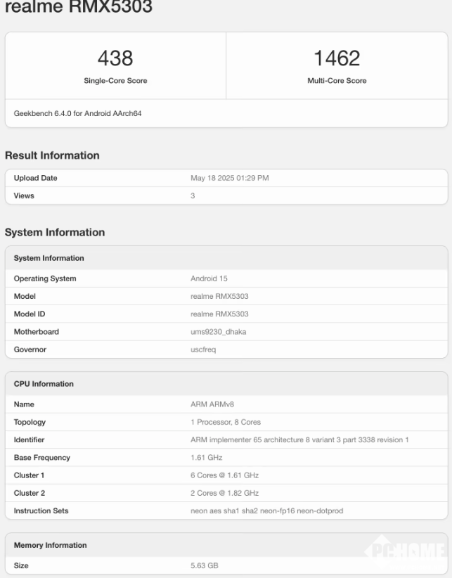 5月20日消息,realme真我旗下一款型号为C71的海外机型现已现身Geekbench数据库,该机型号为RMX5303, 提供6GB RAM,定位低端,搭载安卓15和紫光展锐T7250 4G处理器,即T615处理器,配有45W有线充电。