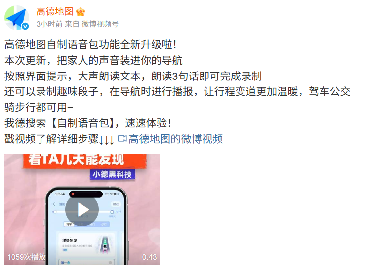 今日高德地图宣布,“自制语音包”功能现在已经提前上线,用户可以将所爱之人的声音录成语音包。