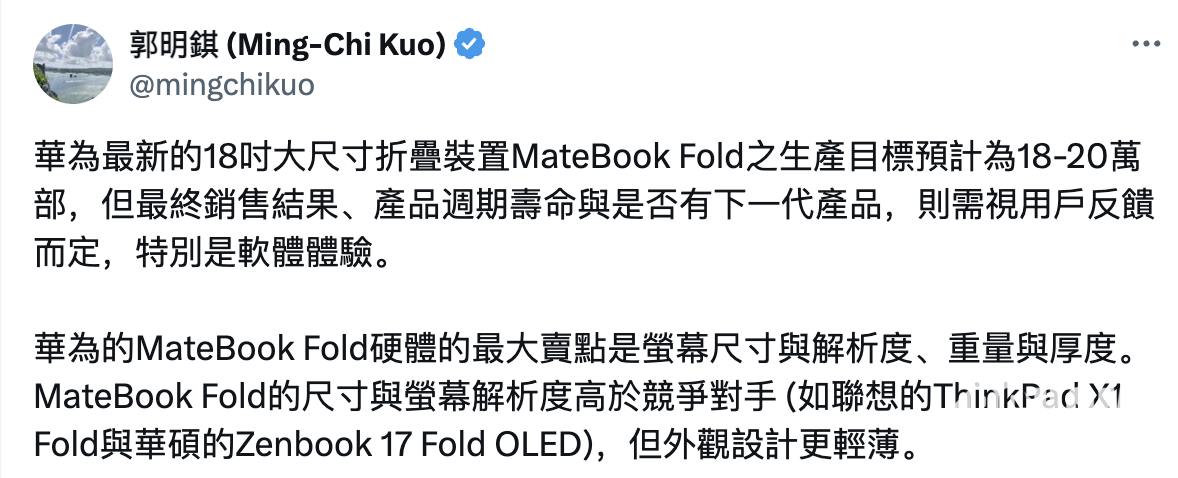 天风国际证券知名分析师郭明錤指出,华为最新的18英寸大尺寸折叠电脑MateBook Fold非凡大师,生产目标预计为18-20万部。