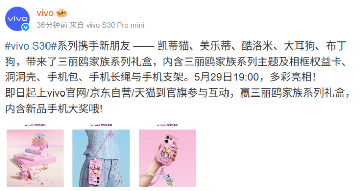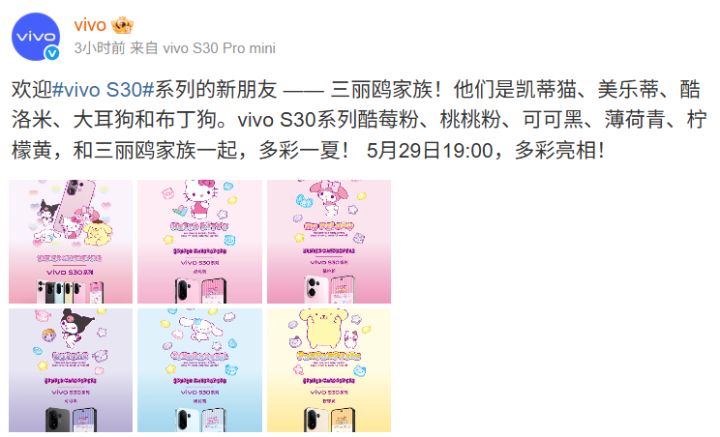 5月21日消息,vivo S30系列手机将于5月29日晚7点发布,官方今日公布该手机三丽鸥家族系列礼盒。