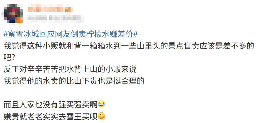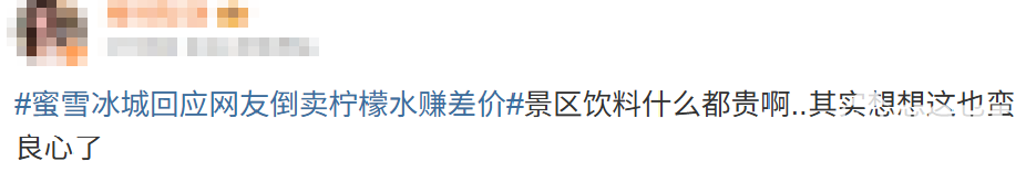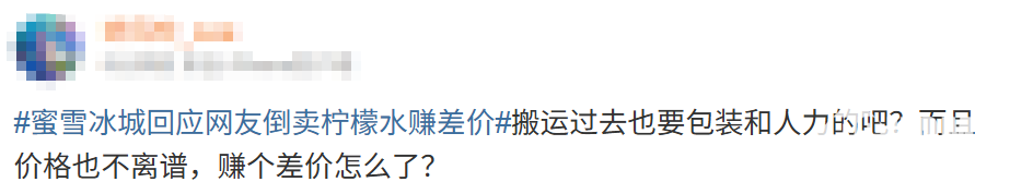 网友纷纷表示,“景区饮料什么都贵,其实想想也蛮良心了”、“搬运过去也要包装和人力吧而且价格也不离谱,赚个差价怎么了?”,还有人表示,“这种摆摊质量达不达标不知道,喝出事了怎么办?还让蜜雪这个企业买单?”,也有不少网友还对该行为构不构成侵权展开讨论。