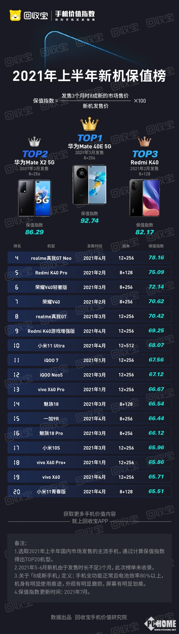 今日,回收宝公布了2021上半年新机保值榜,保值指数就是发售3个月时8成新的市场售价/新机发售价。其中华为Mate40E 5G以92.74的保值指数登顶,这与其强悍的产品竞争力以及供需不足有着直接关系,而华为Mate X2 5G次之(86.29),Redmi K40(82.17)排在第三位。