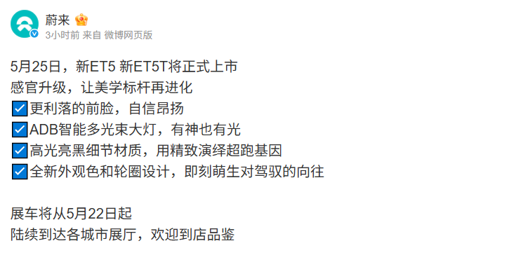 近日,蔚来正式发布了新款ET5和ET5T车型的官图,两款新车已于5月10日开启预定,预定金5000元,将于5月25日正式上市。