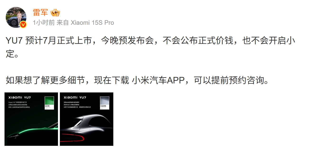 今日,小米创办人,董事长兼CEO雷军发布微博称:YU7预计7月正式上市,今晚欲发布会,不会公开正式价钱,也不会开启小定。并表示“如果想了解更多细节,现在下载小米汽车APP,可以提前预约咨询”。