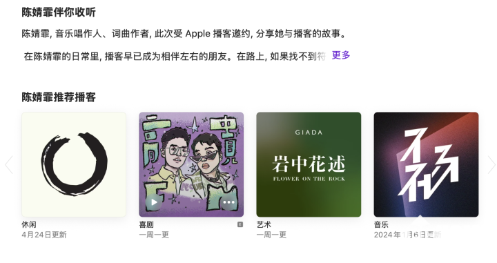 陈婧霏还推荐了多档风格迥异的播客:《得意忘形》以自由深度又轻松的对话打动她;《高贵 FM》用幽默探讨 30 + 年龄段的困惑;《岩中花述》以女性创作人视角传递生命力;《不在场》则展现了对爱好的纯粹与对未知的探索。这些推荐不仅折射出她的创作理念,也为用户提供了多元的听觉选择。