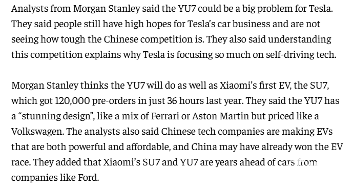 尽管昨天发布会上,雷军并未公布小米YU7的售价,也没有开启新车预订。但海外媒体普遍表示小米汽车将会威胁到特斯拉销量。据经济时报援引摩根士丹利的分析师认为,小米YU7拥有“惊艳的设计”,就像法拉利或阿斯顿马丁的混合体,但价格却是大众。中国科技企业可能已经赢得了新能源汽车的竞赛,中国市场的竞争将更加激烈。