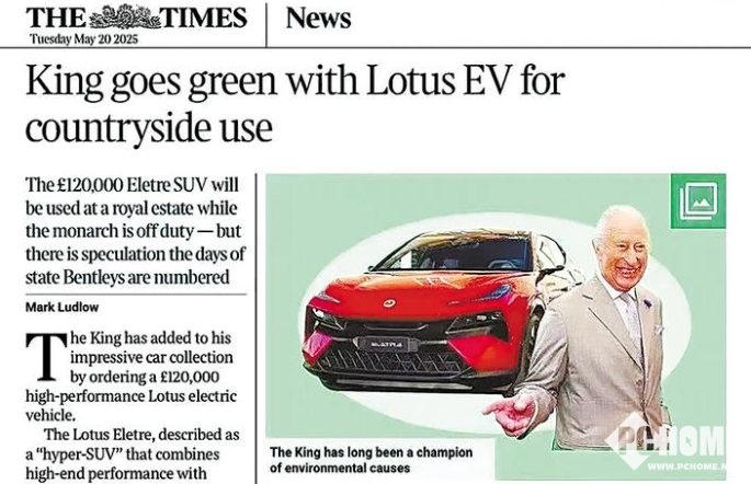 2025年5月23日消息,近日,英国国王查尔斯三世购买了一辆中国生产制造的电动汽车的消息,登上《英国泰晤士报》。查尔斯三世购买的是一辆莲花Eletre,价值12万英镑(约合人民币116万)。莲花跑车创立于1948年英国,2017年被吉利收购,汽车由武汉经开区的莲花汽车全球智能工厂生产。