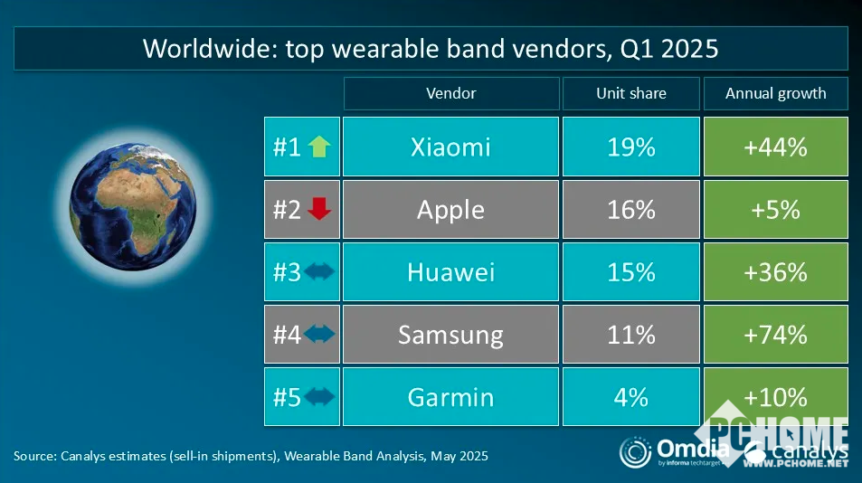 近日,Canalys(现并入Omdia)披露的调研报告显示,2025年一季度,全球可穿戴腕带设备市场同比增长13%,出货量达4660万台。