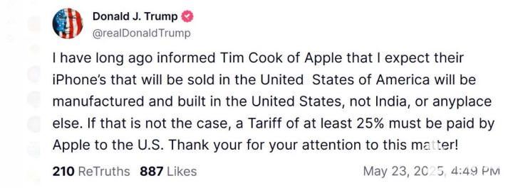 2025年5月23日消息,援引美国媒体报道,美国时间星期五,美国总统特朗普在社交媒体发文表示,已经警告过苹果CEO蒂姆·库克,要求在美国市场销售的iPhone必须在美国本土制造生产,而非印度或其他地区。若未遵守,苹果需向美国缴纳至少25%的关税。