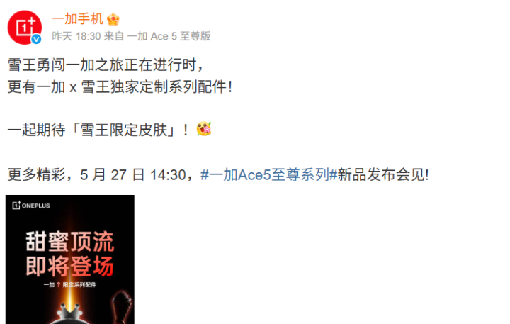 5月26日消息,此前一加曾官宣Ace 5至尊版的新朋友蜜雪冰城,并表示“欢迎雪王来一加手机发布会”。据昨日官方消息,一加将推出雪王独家定制系列配件。