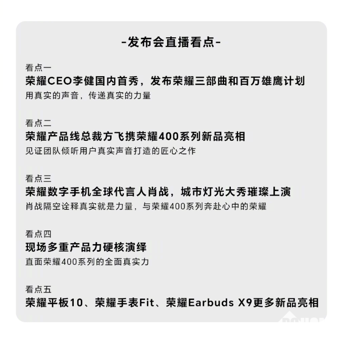 本次荣耀发布会直播看点丰富:CEO李健国内首秀并发布荣耀三部曲与百万雄鹰计划;产品线总裁方飞携荣耀400系列新品亮相,展现倾听用户声音的匠心之作;全球代言人肖战助力,城市灯光大秀璀璨上演诠释真实力量;现场硬核演绎产品力,展示荣耀400系列全面实力;还有荣耀平板10、手表 Fit、Earbuds X9等更多新品登场。