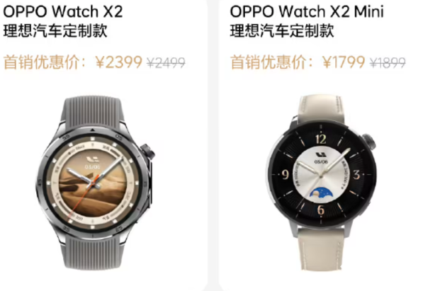 理想汽车与OPPO联名定制的OPPO Watch X2/Mini理想汽车定制款现已在理想商城App上线,Watch X2定价为2499元,首发价2399元;Watch X2 Mini定价为1899元,首发价1799元。