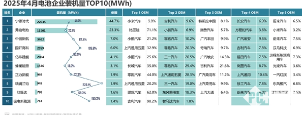 2025年4月动力电池市场中,比亚迪旗下弗迪电池以23.3%的市占率稳居第二,装机量达11.501GWh,同比增长22.1%,电池供应结构中,比亚迪系品牌,包括比亚迪、腾势、方程豹,占比80.4%,而外供占比突破10%。