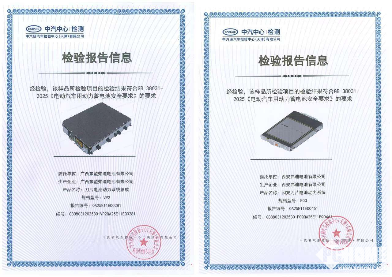 近日,比亚迪官宣,自家的刀片电池和闪充刀片电池双双提前通过最新国标GB 3803-2025《电动汽车用动力蓄电池安全要求》全项检测,并获得中汽研汽车检测中心专业认证证书。