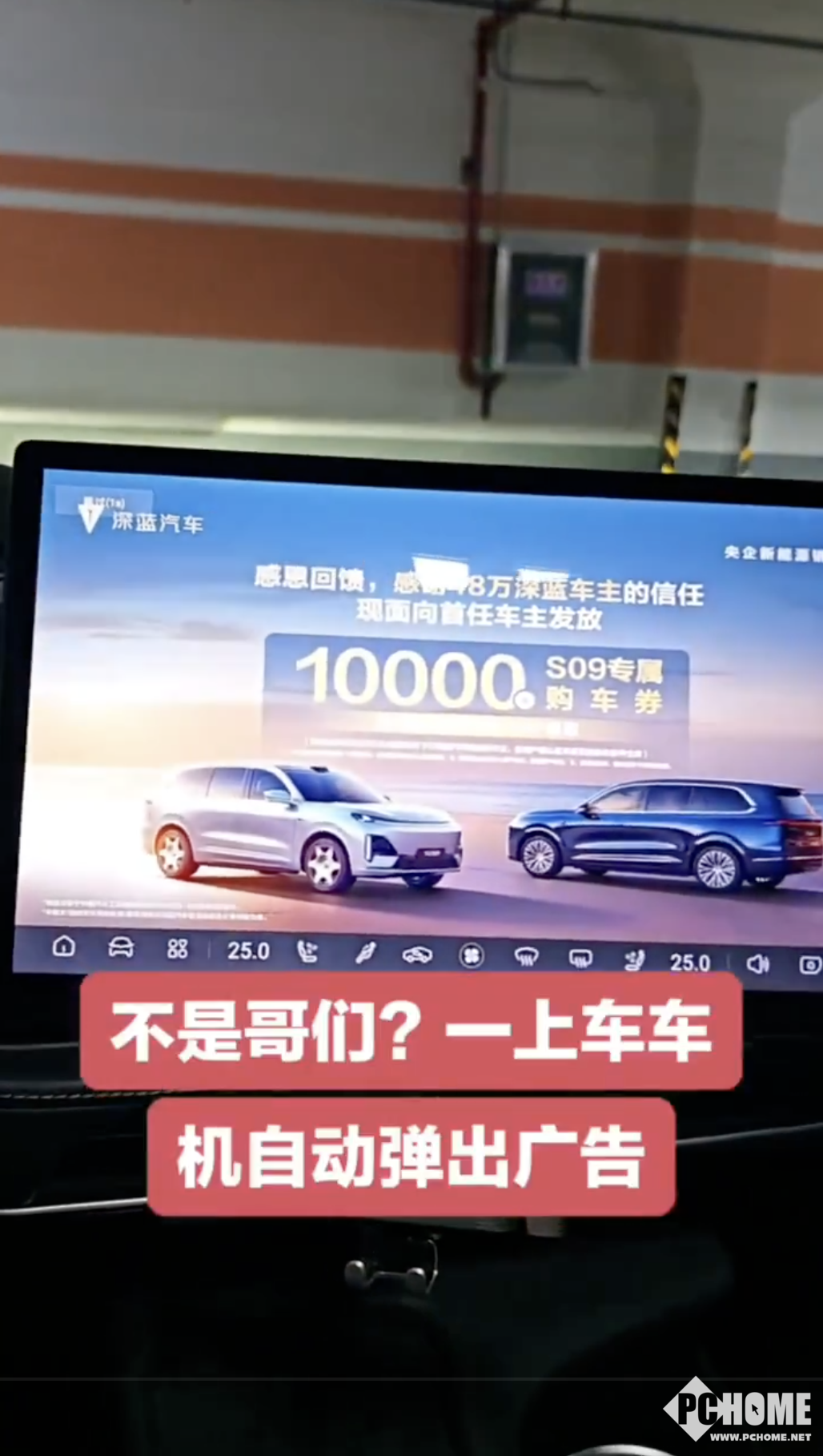 PChome根据网友提供的开机广告照片发现,深蓝汽车在车机屏幕上打出了“感恩回馈,面向首任车主发放专属购车券”宣传语。