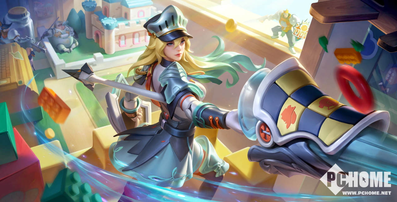 武器设计上,采用潮玩风格的精致枪盾,融合复古气息。其武器格子装饰上绘制着潮玩士兵们的头像剪影,象征雅典娜凝聚信仰,团结一心的队长形象。