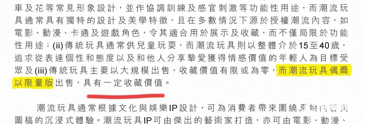 另一方面是泡泡玛特属于潮玩盲盒,具有一定的收藏价值,这不是空穴来风,而是在其招股书上明确提到,具有一定的收藏价值,但仅限于限量版,因为限量出售,所以才会供不应求,以至于有人出高价只为购得一款限量版。