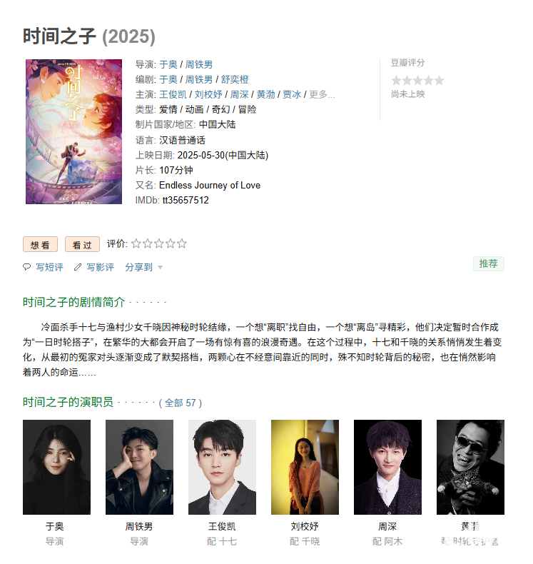 《时间之子》是由上海猫眼影业有限公司、天津猫眼微影文化传媒有限公司、上海剧享影业有限公司出品的动画电影。由于奥、周铁男任导演及编剧,郑志昊、张博任总监制,孙凌宇任监制,舒奕橙任联合编剧,孙凌宇、张旋任制片人。该片最受关注的原因是该片由王俊凯、周深、黄渤等明星进行配音,于2025年5月30日上映。
