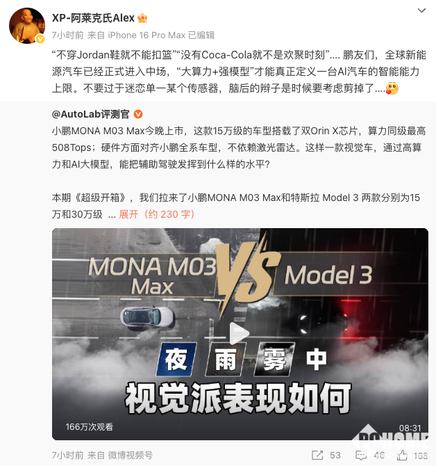 小鹏汽车全新智能电动车MONA M03 Max正式上市前夕,小鹏品牌公关负责人“XP-阿莱克氏Alex”在社交平台发表了一段意味深长的评论,引发业内广泛关注。他表示:“不穿Jordan鞋就不能扣篮?没有Coca-Cola就不是欢聚时刻?”并直言“全球新能源汽车已经正式进入中场,大算力+强模型才能真正定义一台AI汽车的智能能力上限。不要过于迷恋单一某个传感器,脑后的辫子是时候要考虑剪掉了。”