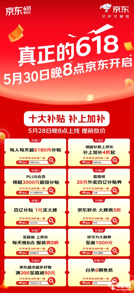 5月28日,PChome从京东获悉,为给消费者带来更加给力的补贴优惠,将提供包括“每人每天补贴超6180元”在内的十大补贴,实现“补上加补”,还会有明星和IP引领。且这一重磅补贴政策将提前到今天,在5月28日晚8点开启,与“京东超级补贴日”一同上线。