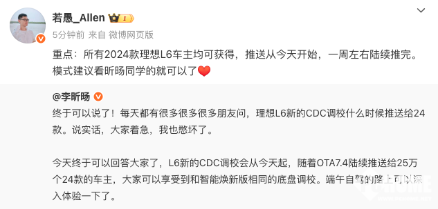 2025年5月28日,理想汽车产品线负责人李昕旸在社交媒体平台发文称,理想L6新的CDC调校将从今天起,随着OTA7.4陆续推送给25万个24款的车主,一周左右推完。