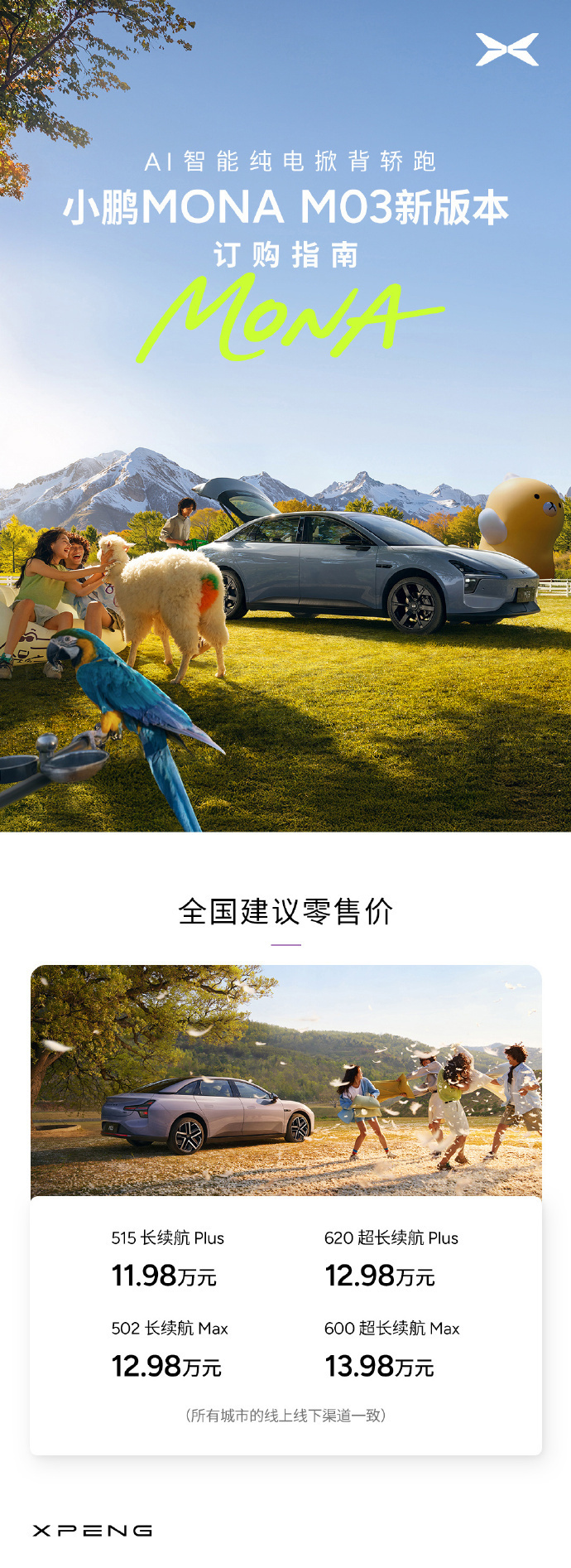 新版小鹏MONA M03的价格为:502长续航Max版12.98万元;600超长续航Max版13.98万元;515长续航Plus版11.98万元;620超长续航Plus版12.98万元。