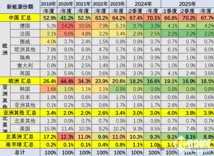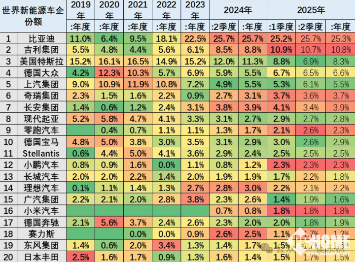 新能源车企份额方面,比亚迪世界领先,吉利占据榜单第二,特斯拉下滑至第三,2025年以来份额持续下滑。榜单前十名,中国车企上汽集团、长安集团和零跑汽车位列其中。