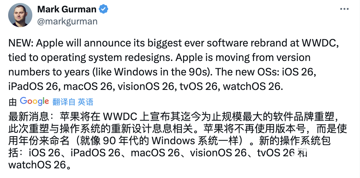 彭博科技记者马克·古尔曼爆料称,苹果公司正计划对其操作系统的命名方式进行一次史无前例的调整。未来的系统版本将不再以传统的数字版本号命名,而是统一采用“年份制”。