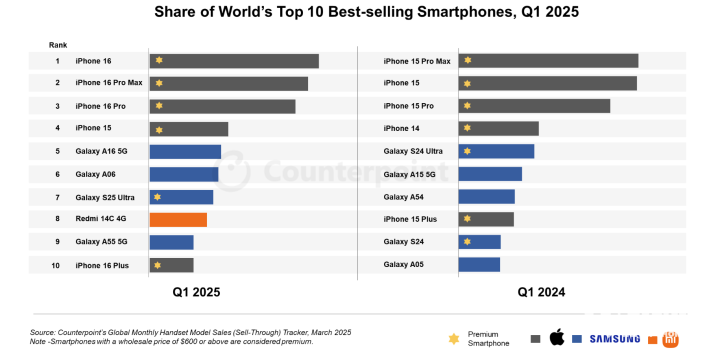 2025年5月29日消息,市场调研机构Counterpoint Research数据显示,iPhone 16成为2025年第一季度全球最畅销的智能手机,iPhone 16 Pro Max紧随其后,位列第二,iPhone 16 Pro位列第三,iPhone 16系列包揽前三名。三星Galaxy占有四席,REDMI 14C 4G位列第八,小米成为唯一进入前十榜单的中国手机品牌。